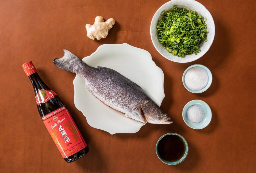 - Splash the fish with the shao hsing. Add some water to the base of the tray to ensure there is enough liquid to create steam. Cover the tray with foil.